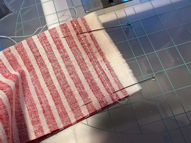 I cut my binding strips to 2-1/4 for these smaller projects. 2-1/2" is a bit wide. I also don't fuss with diagonal joins-- especially here with a stripe-- okay, it's less bulky, but why start piecing diagonals when a piece is all right angles? You can also get some really bad, jarring joins, depending on the fabric, like this: