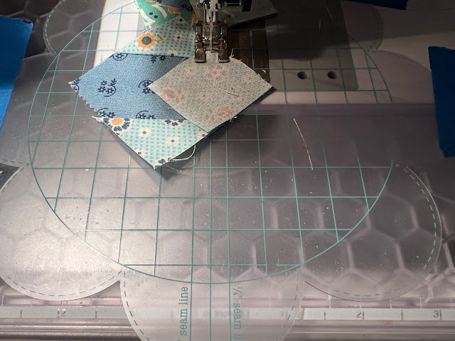 Awhile ago, I bought this Lori Holt accessory-- the woman is a marketing genius-- which you tape to your sewing machine base and simply hold the points of your squares on a line, then just sew across, instead of drawing a line. This has been taped to my machine for months-- it's cute-- I finally tried it.