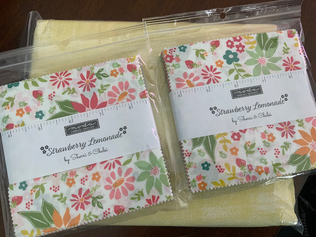 All the measurements on this have already been figured out on past projects I did this to-- so all I have do is just write over the squirrel borders with sewing machine things I can just lift from the mug rug. And of course, make it, which will take some time. I have my Strawberry Lemonade Charm Packs and some background possibilities ready to go. Pink and I are the best buddies we have ever been-- but I'm taking a break from it! Yellow, anyone?