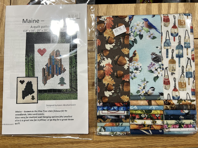It's a great little I Love Maine wall hanging with a set of extremely meaningful jelly roll strips with all the Maine things-- Lobster buoys, chickadees, blueberries, etc., etc. This would be great in my new studio-- or there's endless gifting opportunities for new Maine friends-- or family you are trying to get to move here.